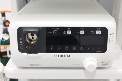 当院では、2024年5月に発売された富士フイルム社の最新型内視鏡システム「ELUXEO 8000システム」を導入し、日々の胃カメラ・大腸カメラ検査に用いています。従来の機器と比べて、光源には高出力LEDが採用されており、暗い消化管の中でもムラの少ない安定した明るさを保ちながら、ノイズの少ないクリアな画像を得ることができます。